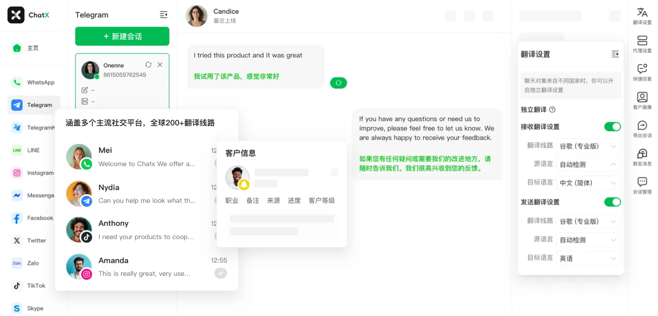 致⼒为企业提供跨境翻译与私域营销的全⾯解决⽅案。覆盖WhatsApp、Telegram、Facebook等海外主流平台,⽀持⼀站式多账号管理和⾼效便捷的粉丝运营。同时,ChatX内置的SCRM客户管理功能与AI技术深度融合,显著提升企业沟通效率,推动可持续增⻓。通过精准的跨境翻译与营销策略,帮助企业拓展更有价值的全球客户,实现⽆缝的出海全流程营销。