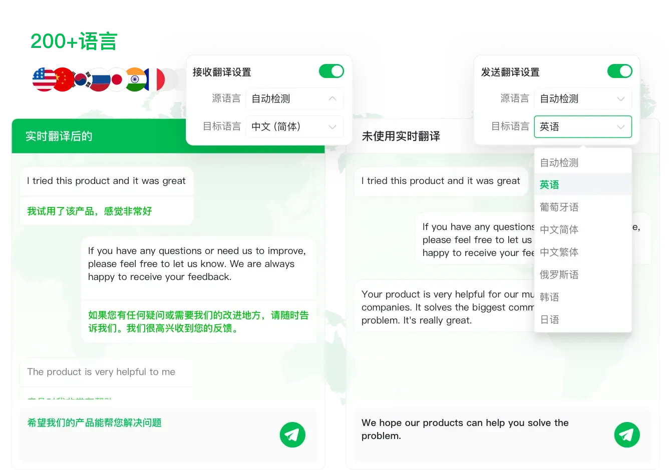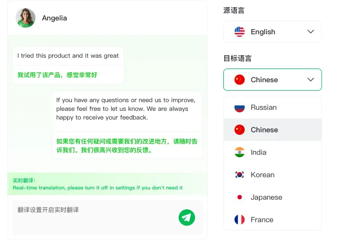 双向实时翻译,聊天消息全自动翻译,无需人工复制粘贴;