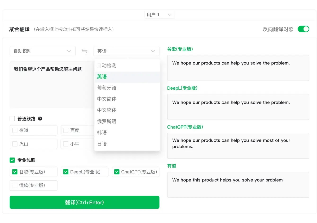 提供谷歌、微软、DeepL等多条国际翻译线路;